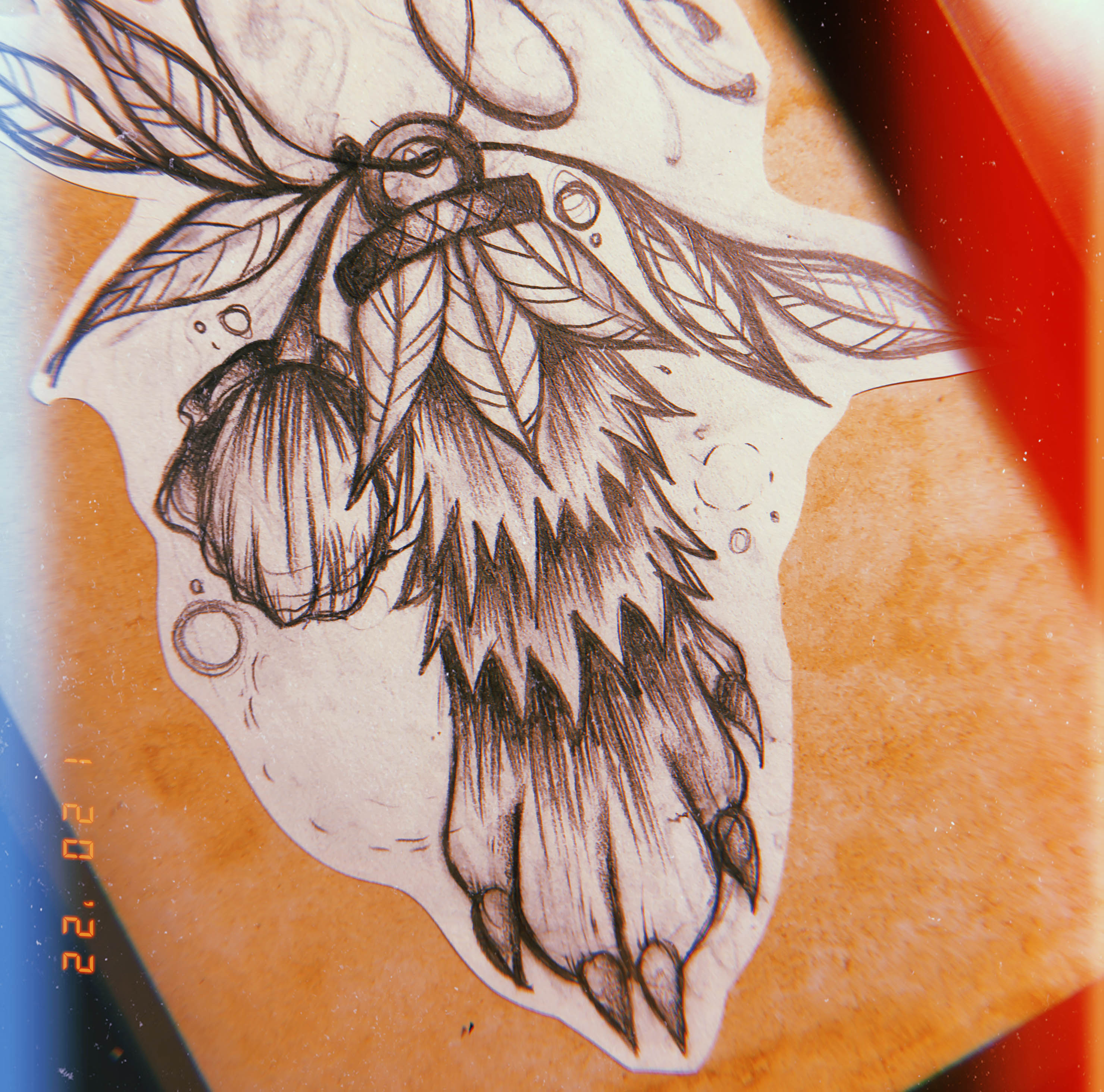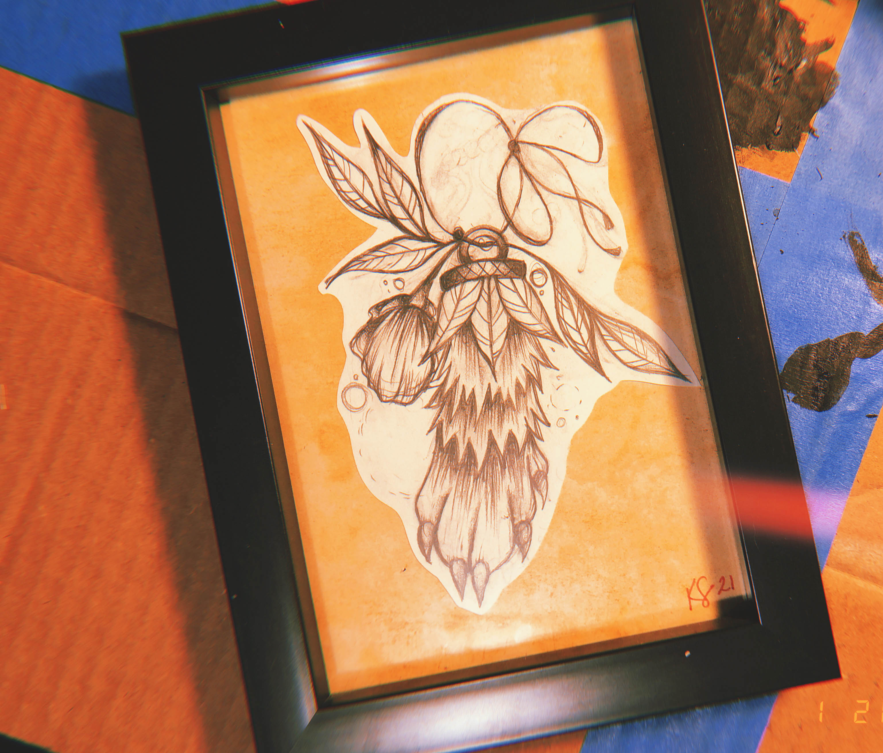 Original tattoo design sketch of a lucky wolf's paw. Pencil, paper, framed and backed with tea-stained paper.