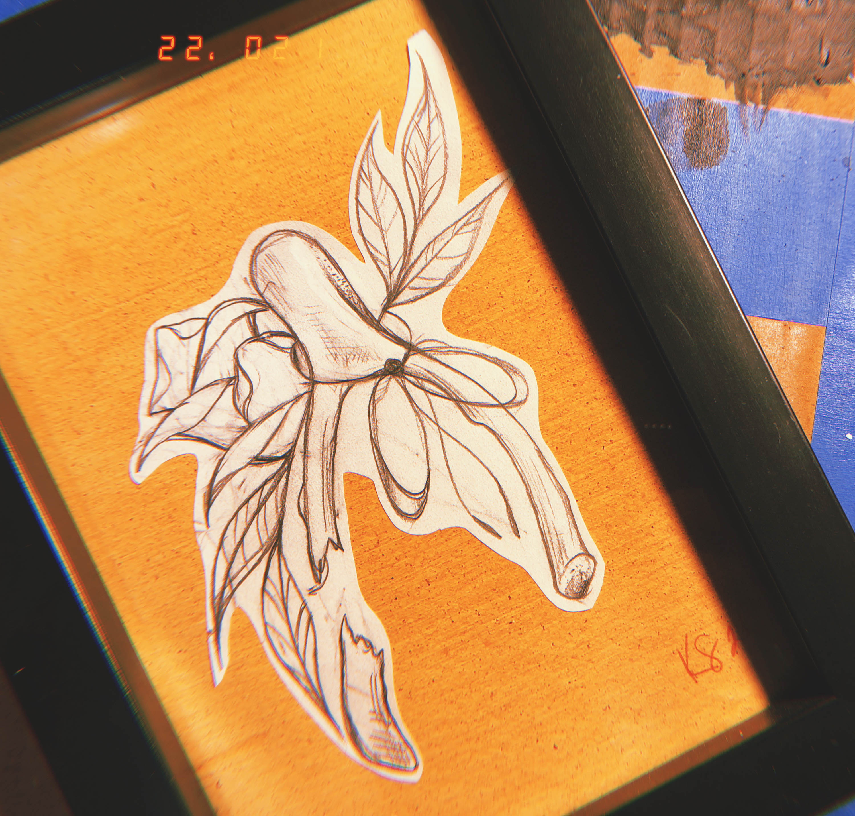 Original tattoo design sketch of a snapped wishbone. Pencil, paper, framed and backed with tea-stained paper.