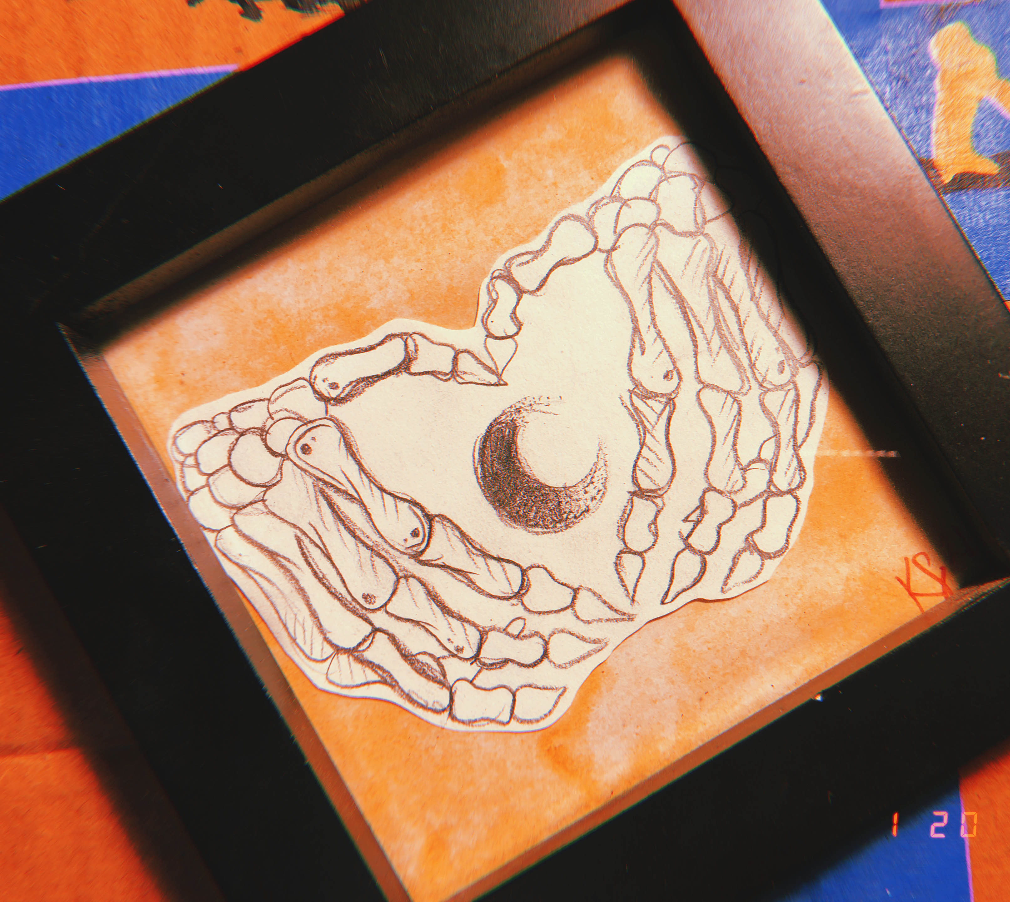 Original tattoo design sketch of skeleton hands in "heart" shape. Pencil, paper, framed and backed with tea-stained paper.