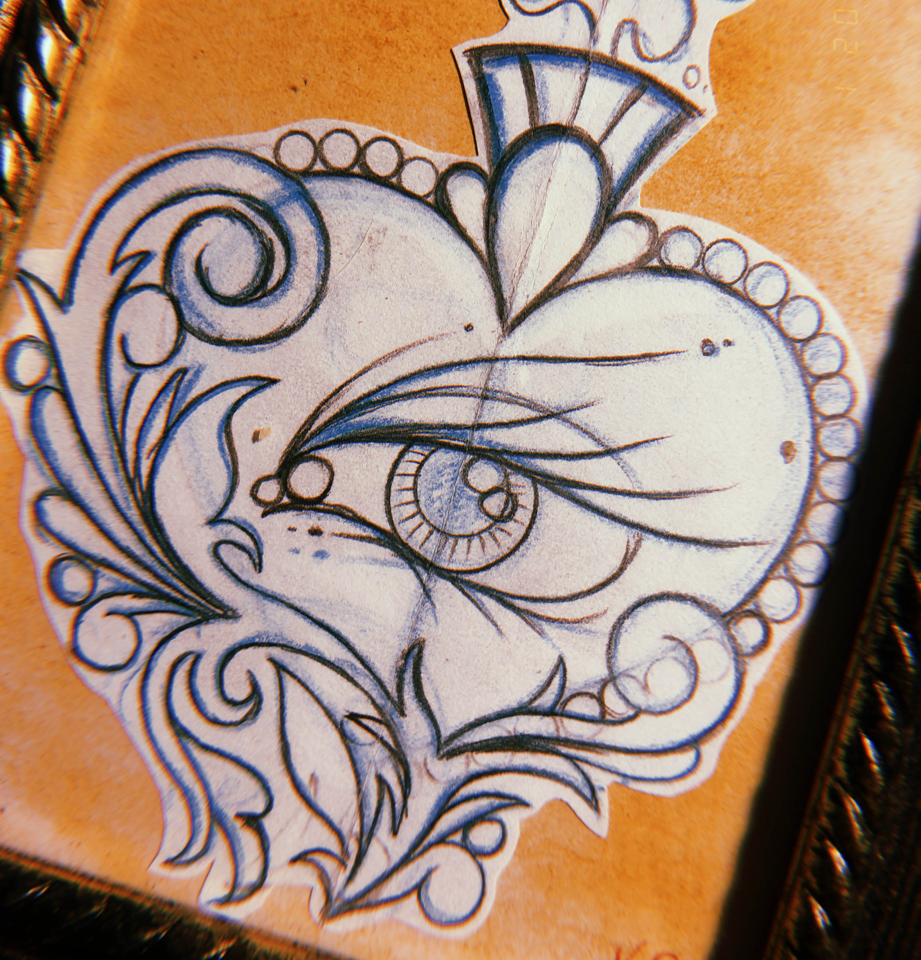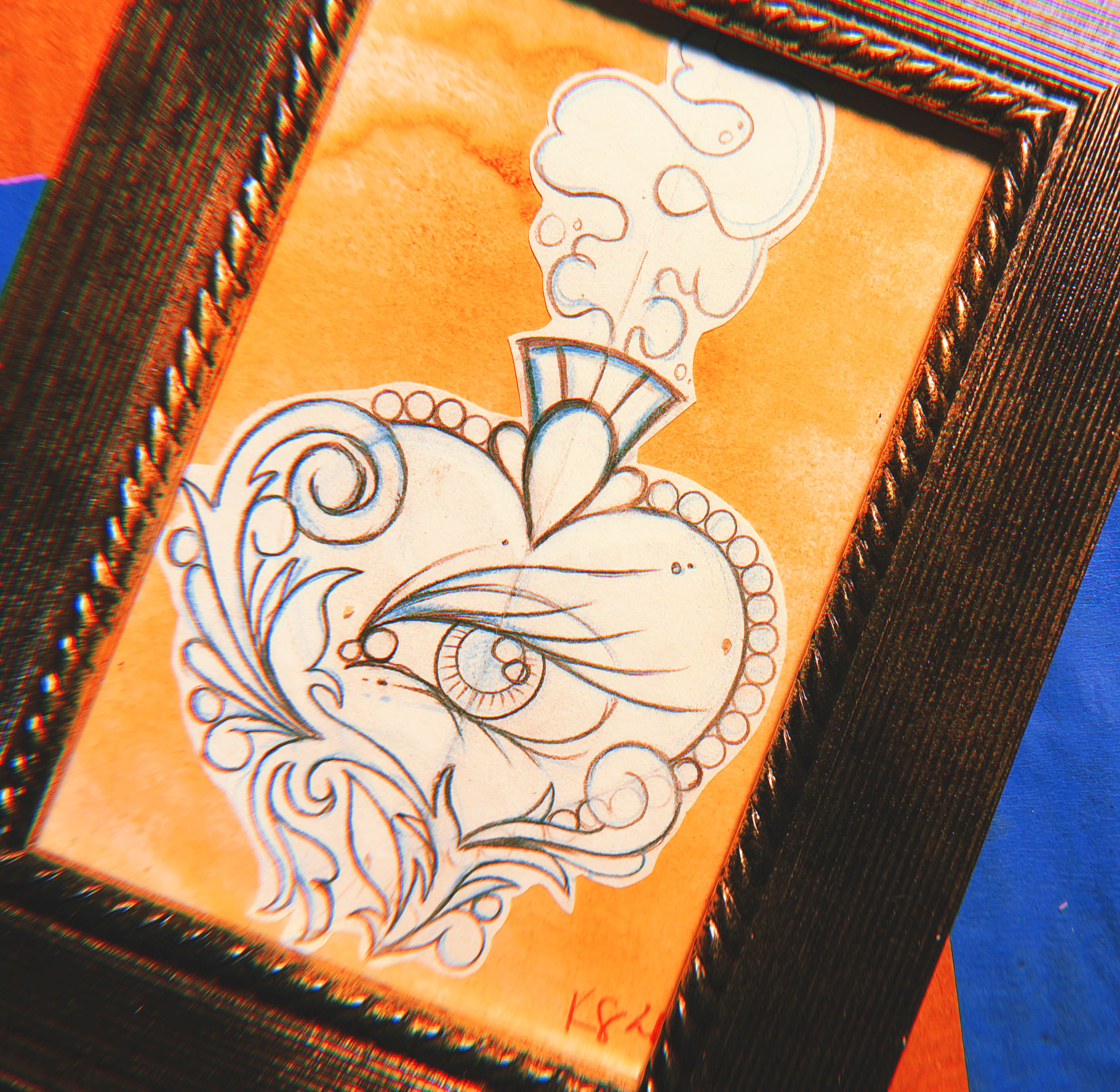 Original tattoo design sketch based on traditional "sacred heart" concepts. Pencil, paper, framed and backed with tea-stained paper.