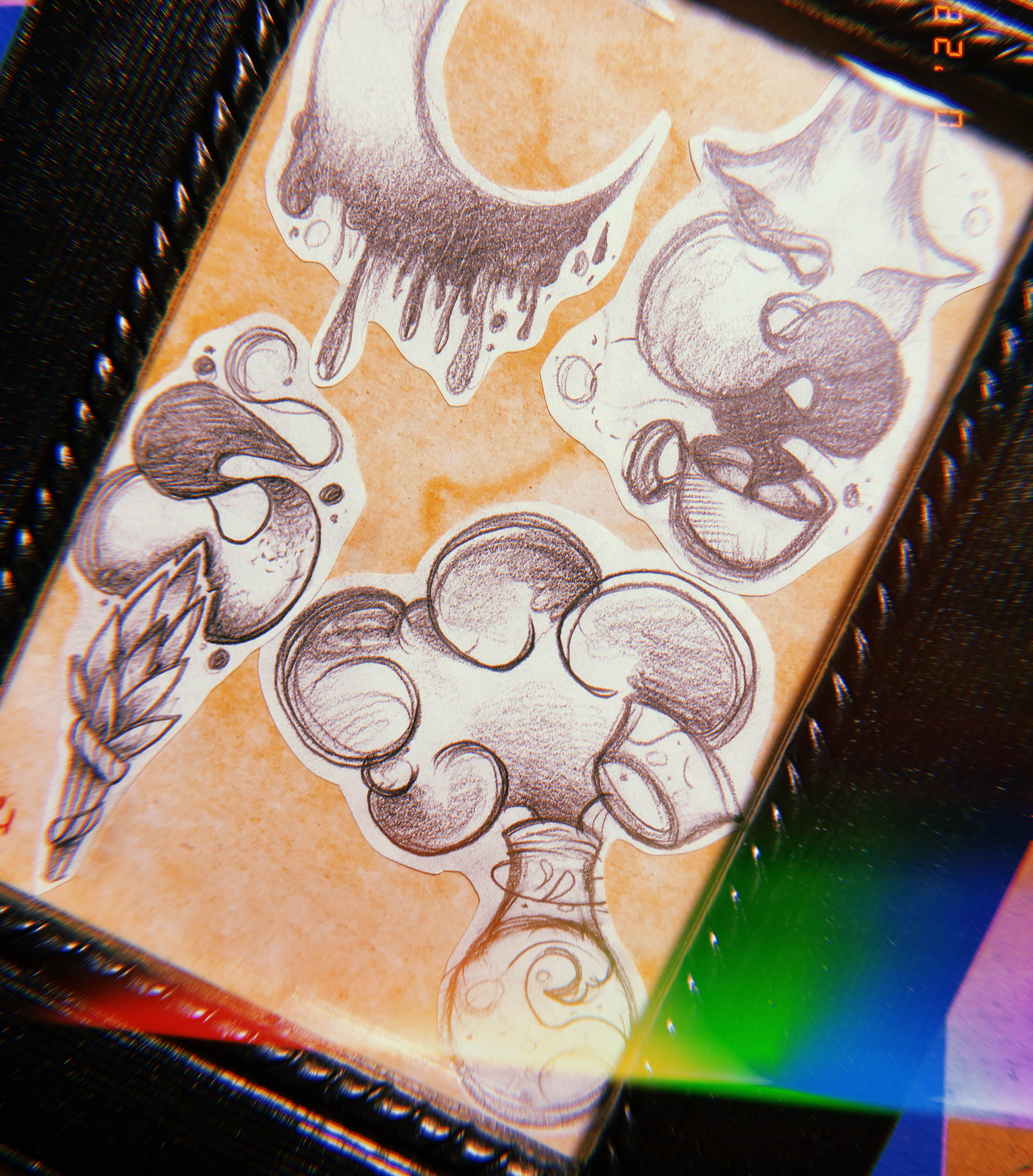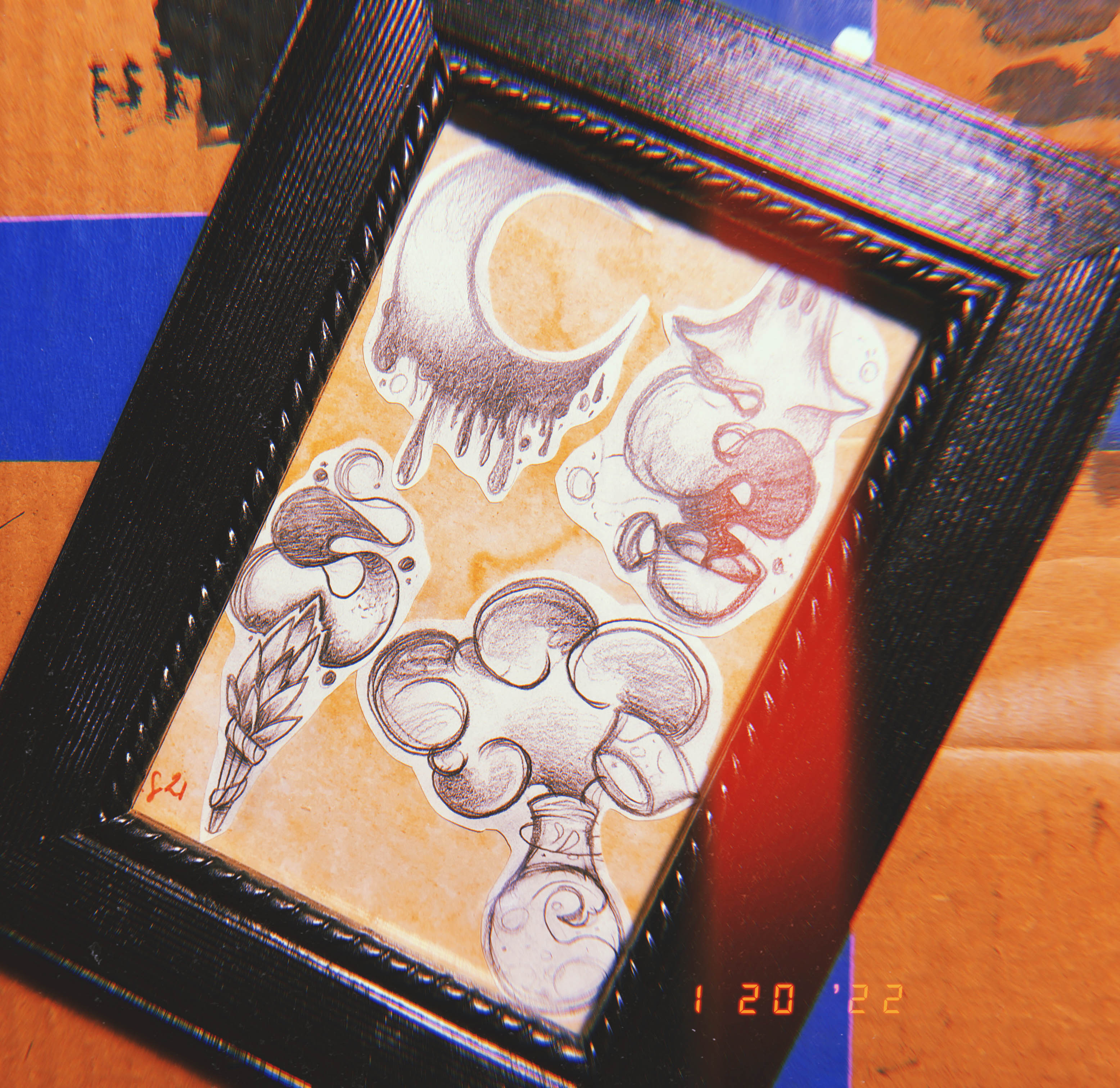 Original tattoo design sketches done for "Friday the 13th" events. Pencil, paper, framed and backed with tea-stained paper.