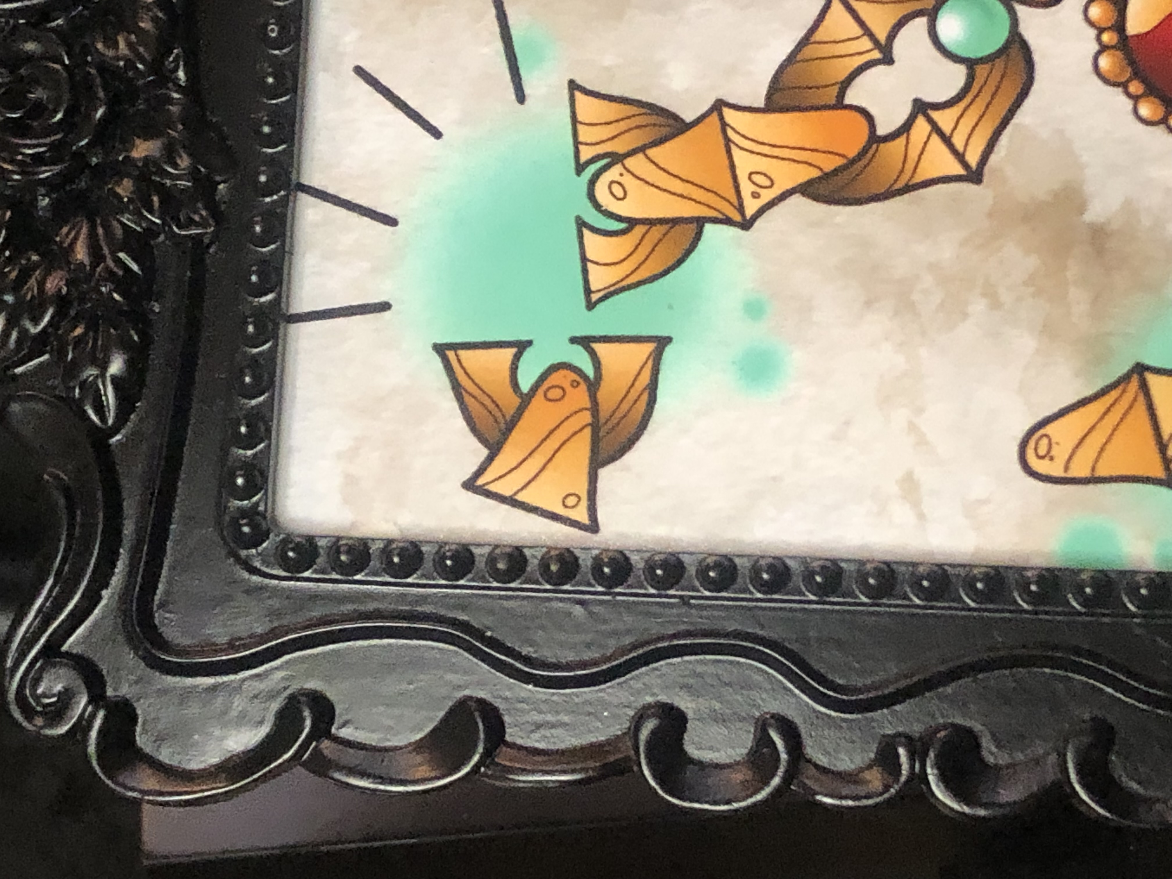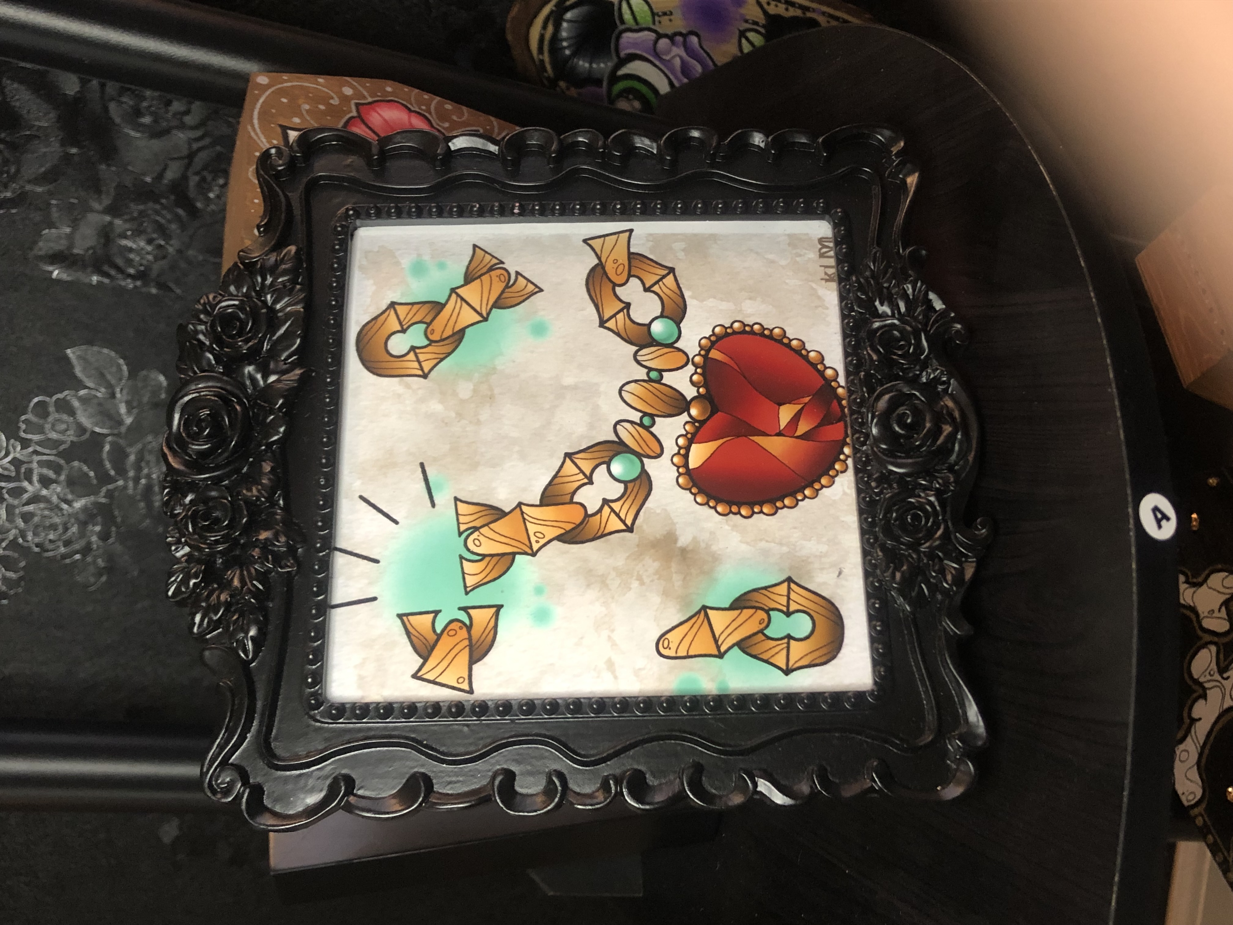 Tattoo-style ornamental chain & heart gem. Framed print. About 9” x 7” including frame. Print 5” x 5”.