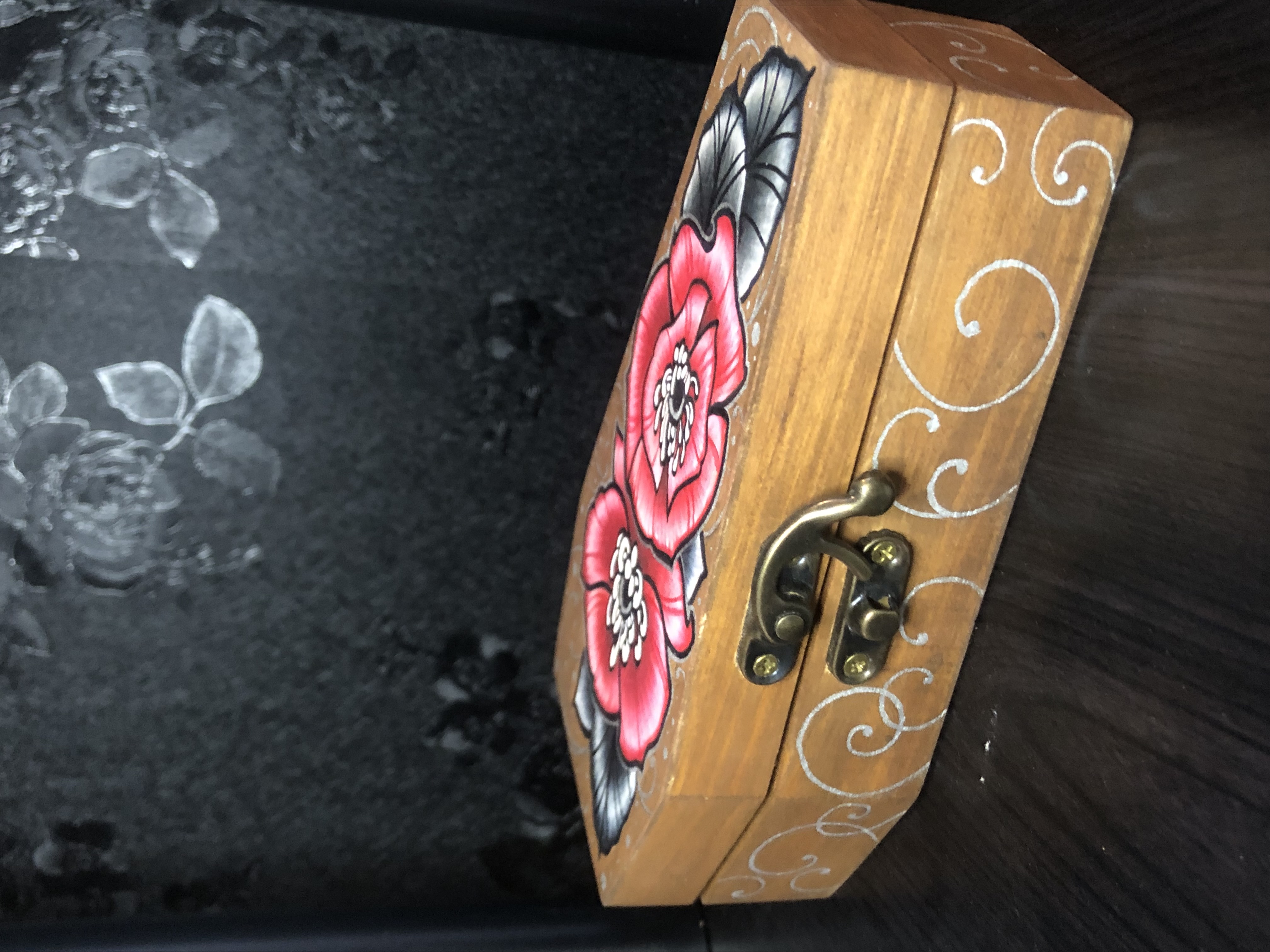 Wooden coffin box for jewelry, trinkets, and other goodies! Stained, distressed & adorned with hand painted image of some poppies. About 6". Handpainted, matte varnish.