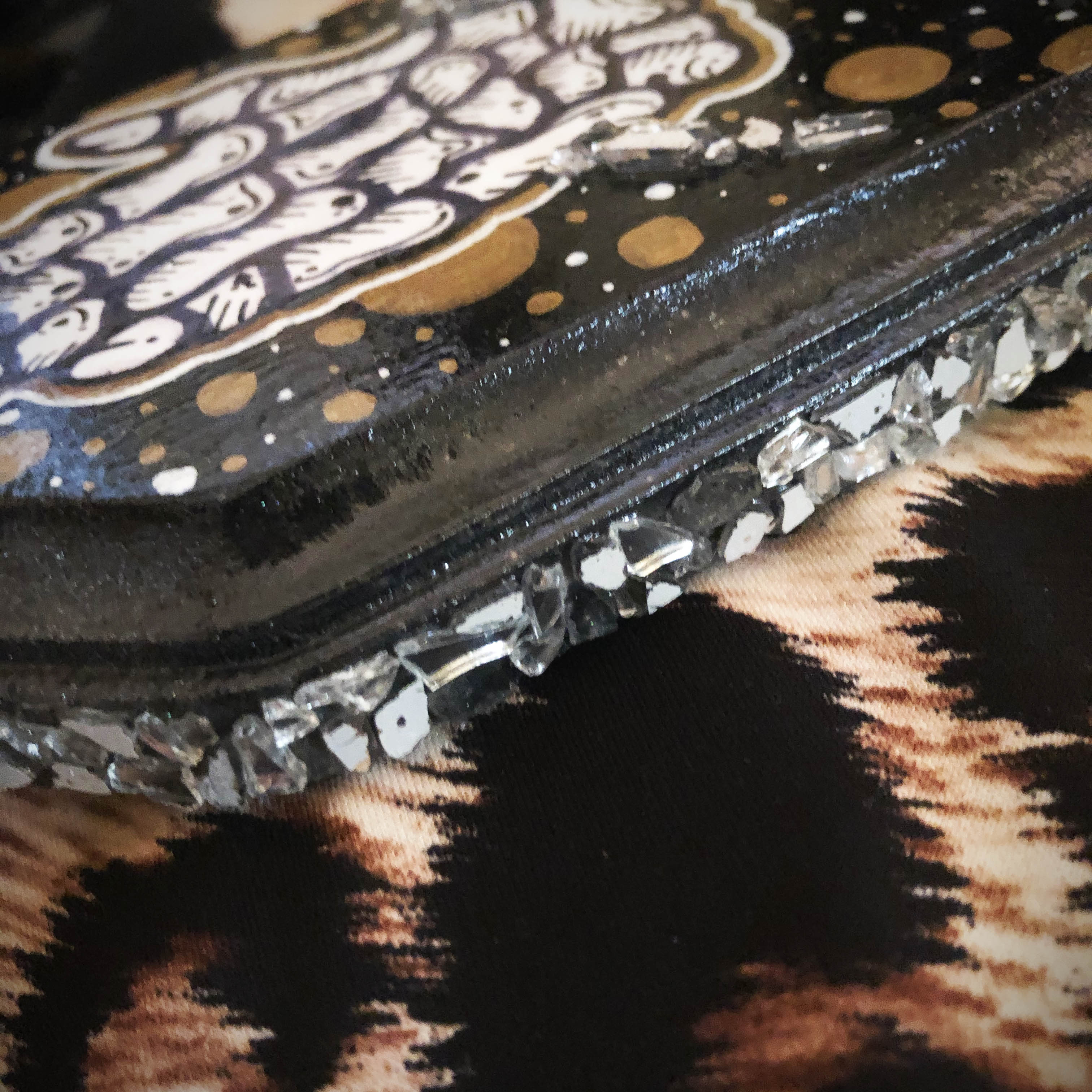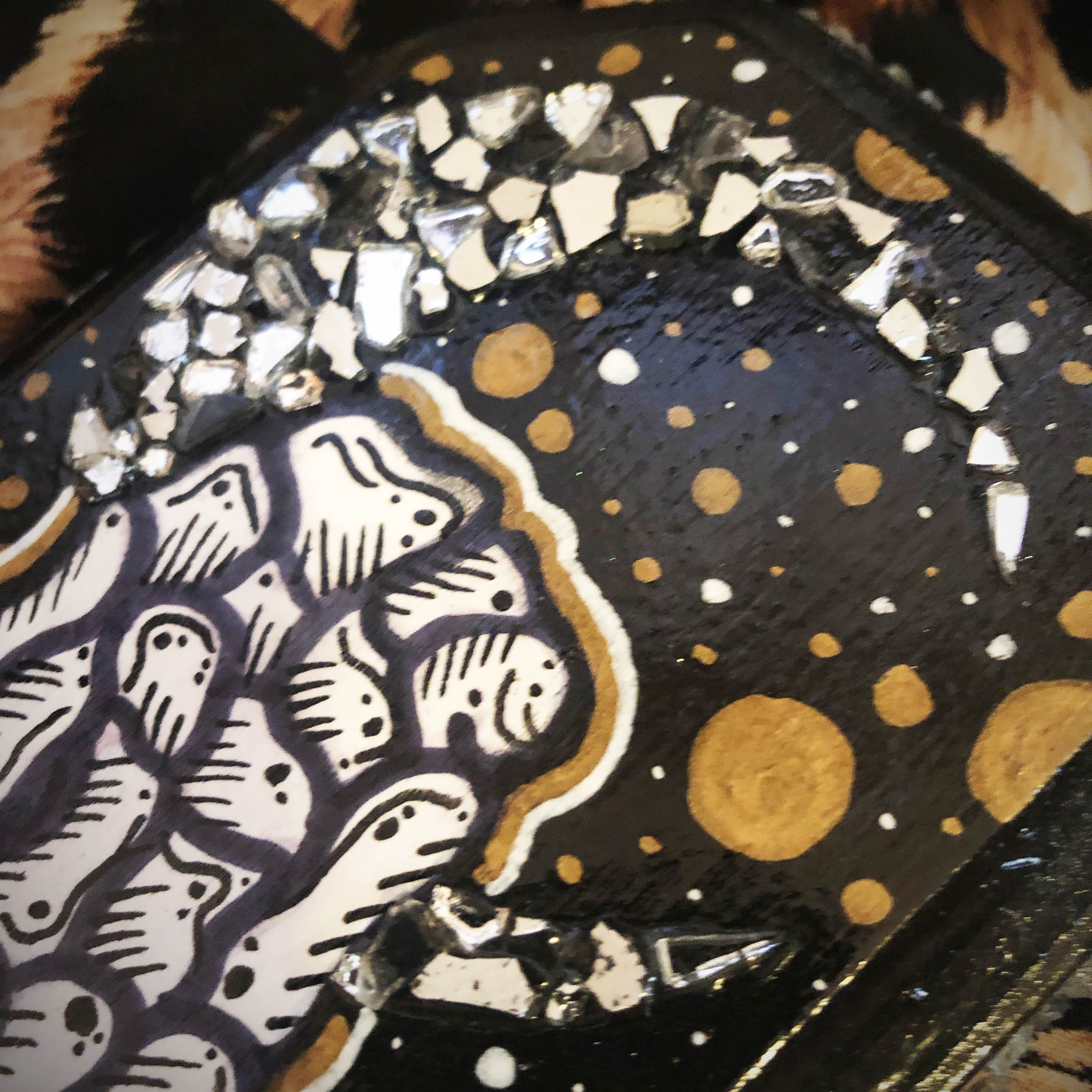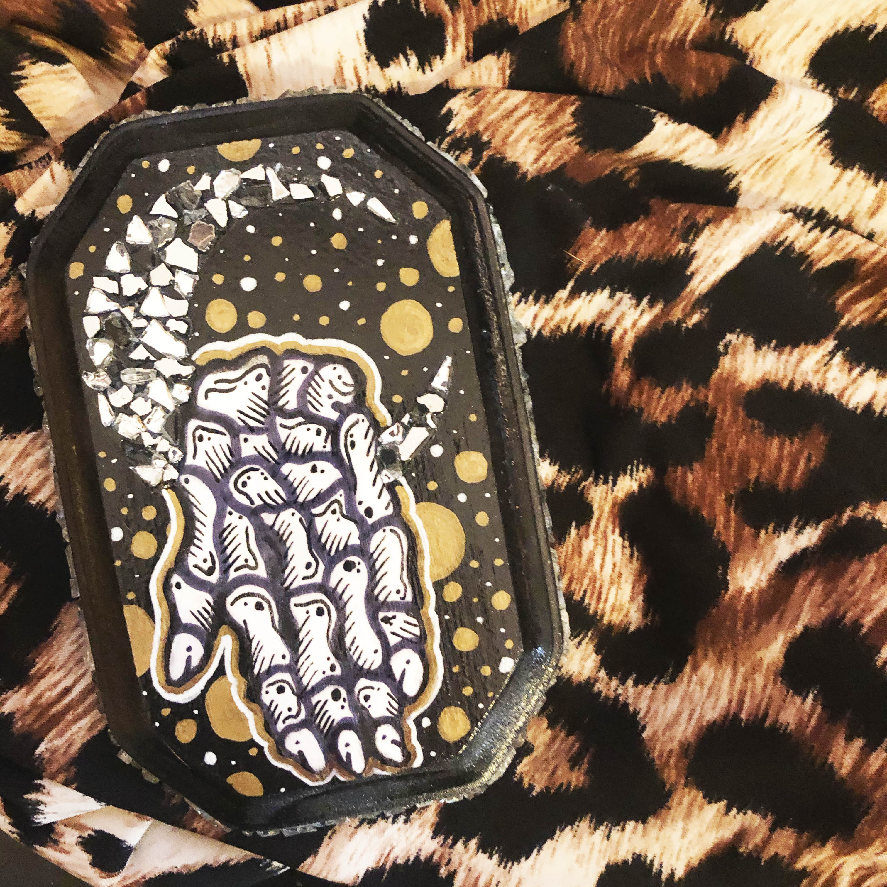 Handpainted skeleton hand design on wooden plaque with mirrored crystals adorning the top and sides. Acrylic, colored pencil, mosaic mirrored crystals & metallic sharpie with clear shiny varnish. Does NOT include hanging materials.