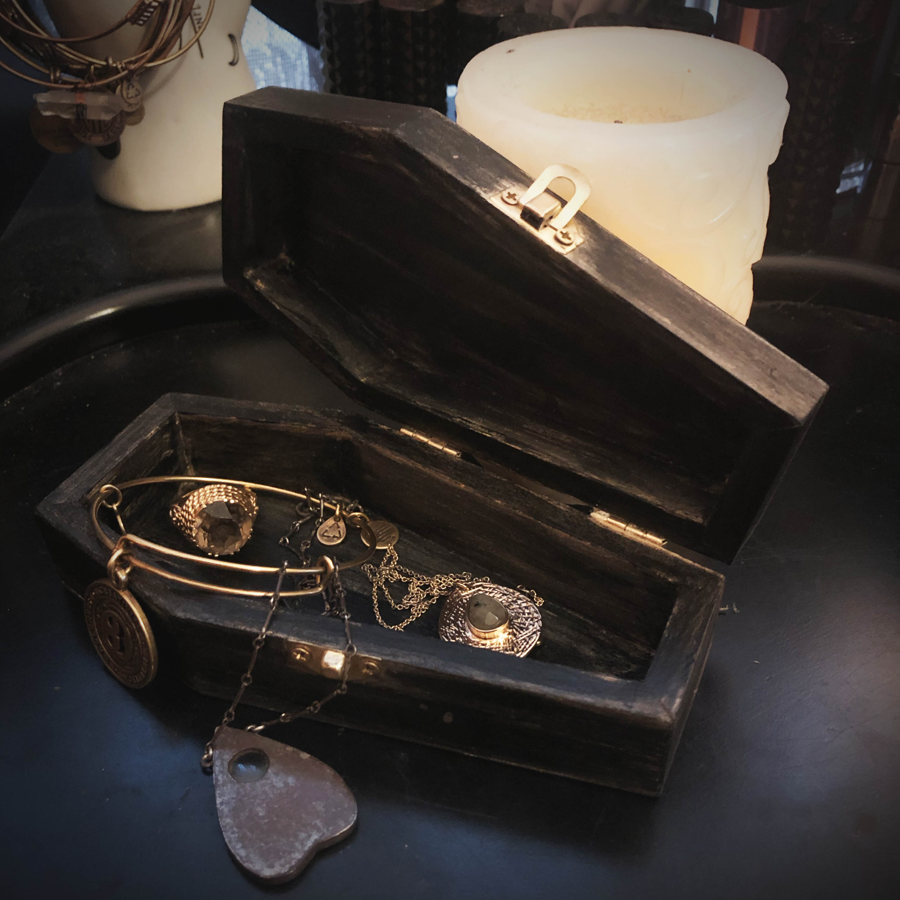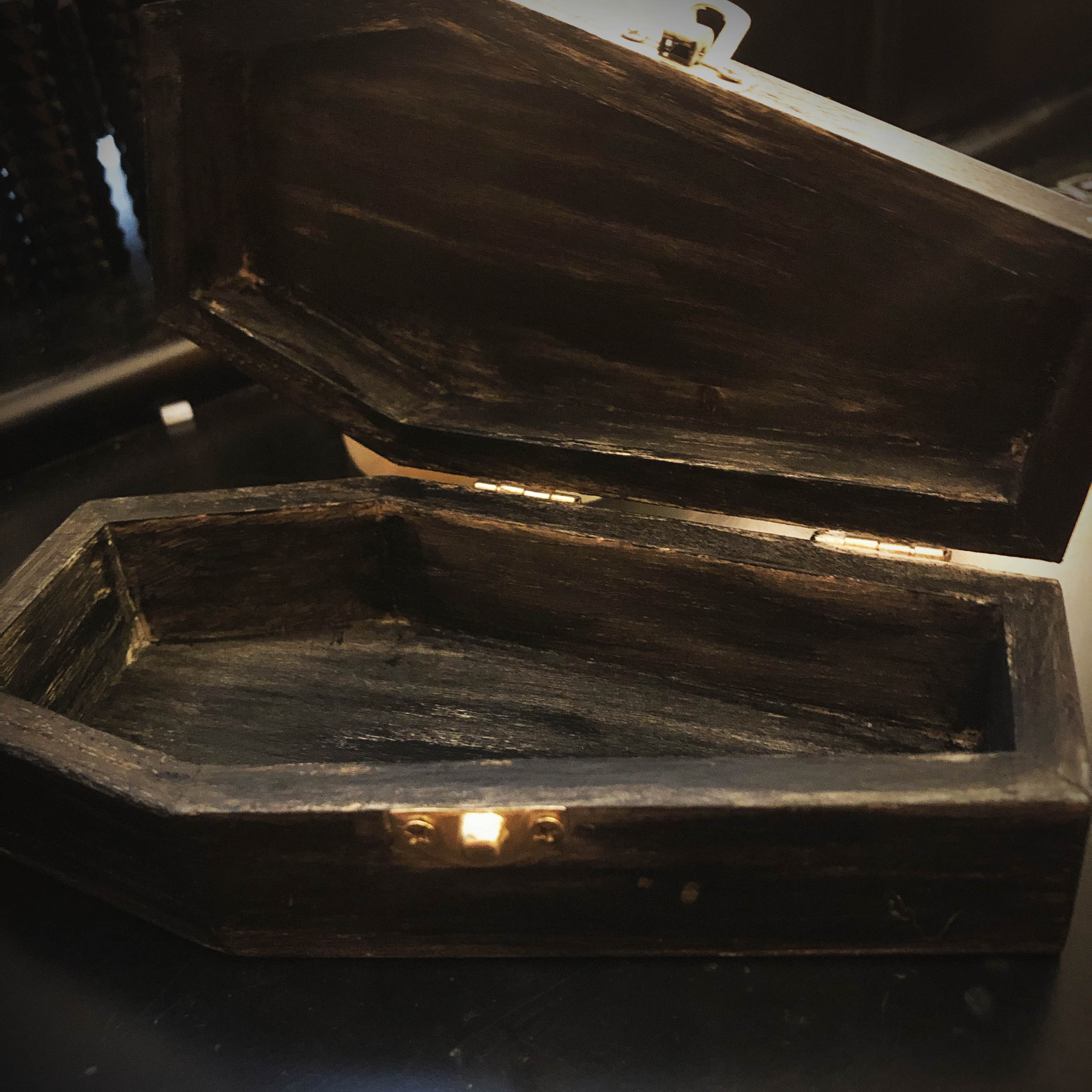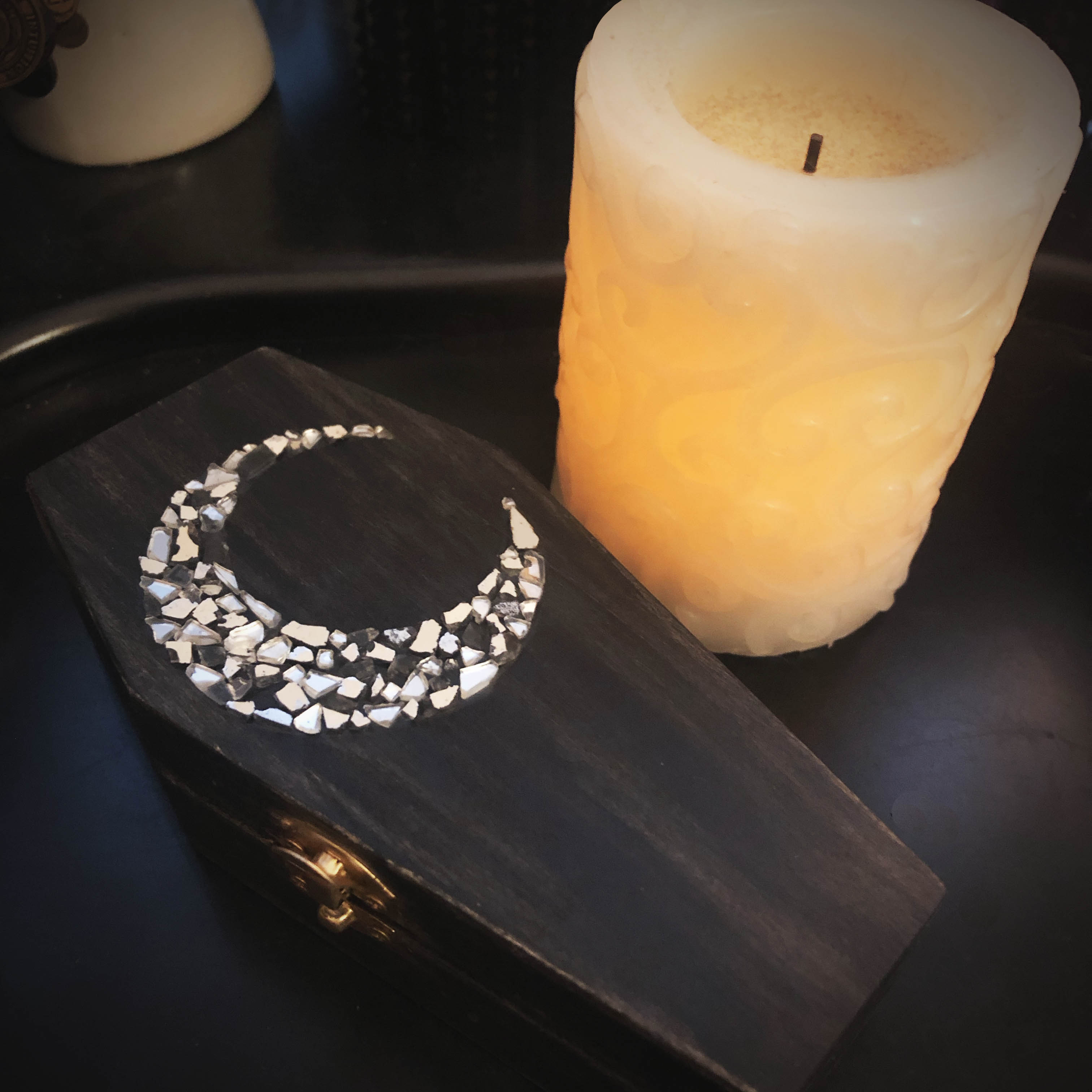 Wooden coffin box for jewelry, trinkets, and other goodies! Painted black, distressed & adorned with clear crystals in moon shape. About 6". Handpainted, matte varnish. Jewelry in photos *not* included.