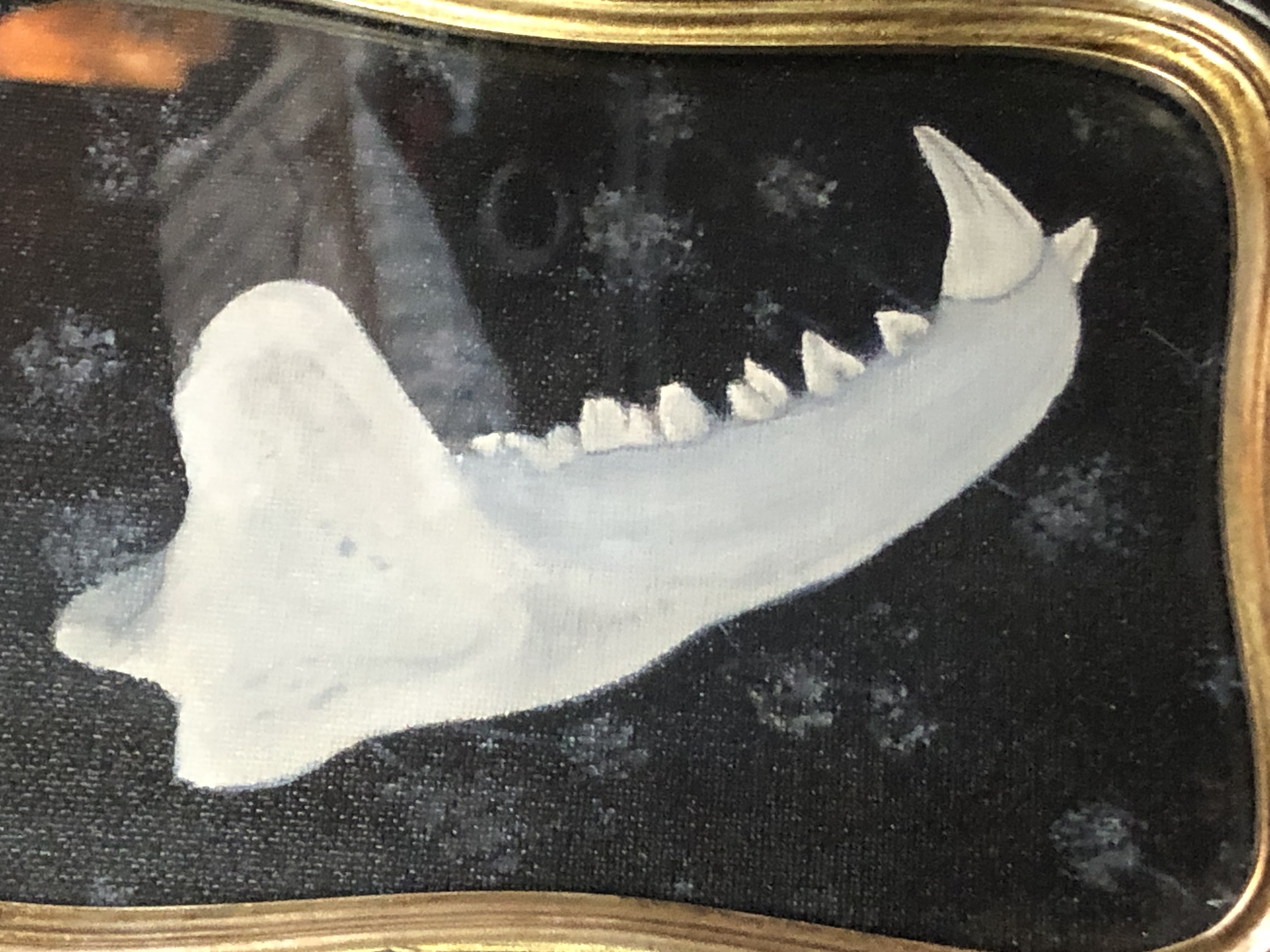 Acrylic painting of a fox jaw. Gold & black ornate frame. Original work, no prints, no reproductions.