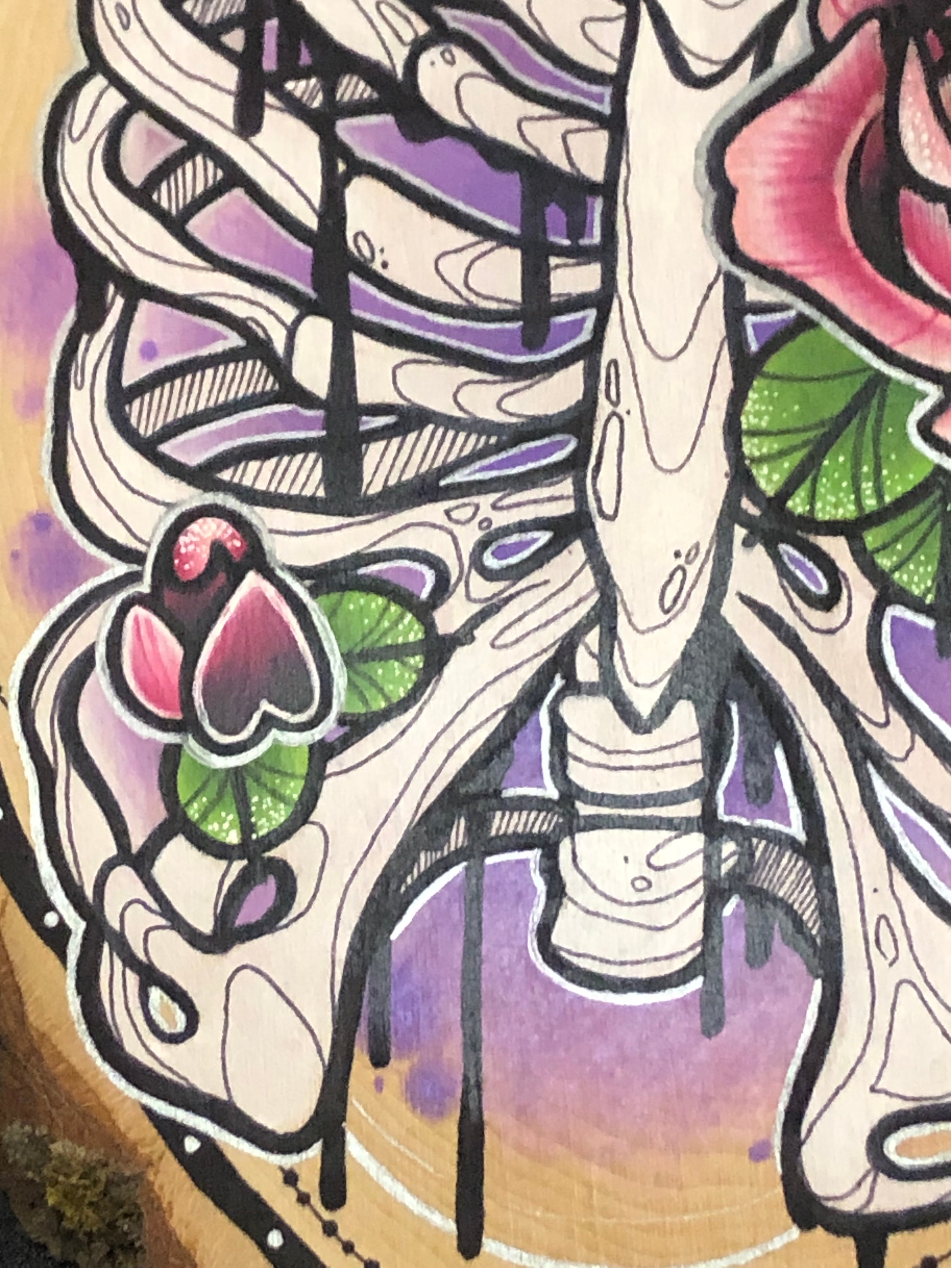 Handpainted image of tattoo-style roses & rib cage on real wood slice. Mixed media. Matte finish. Hanging hardware attached. 10" length.
