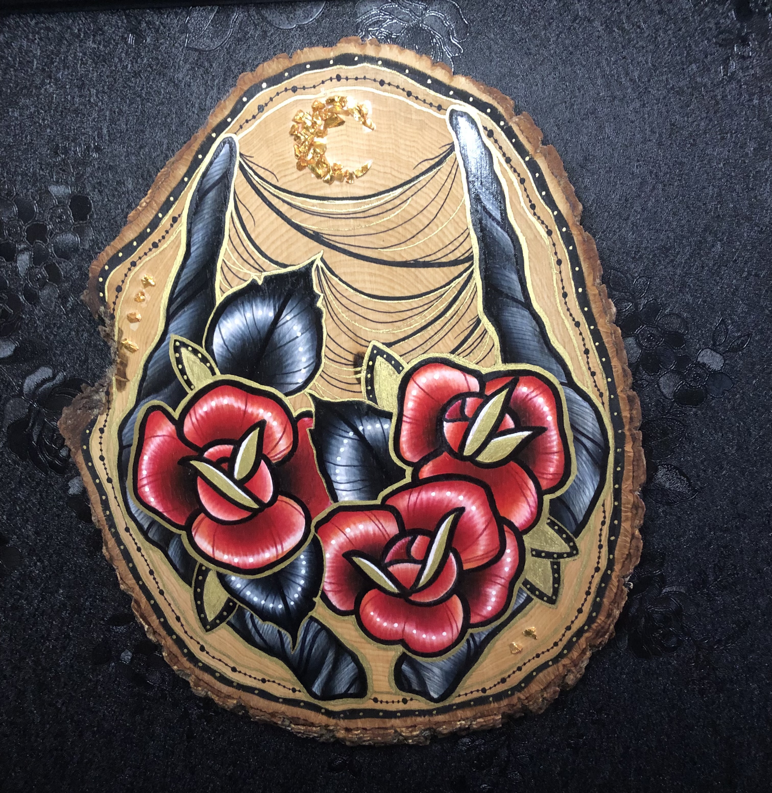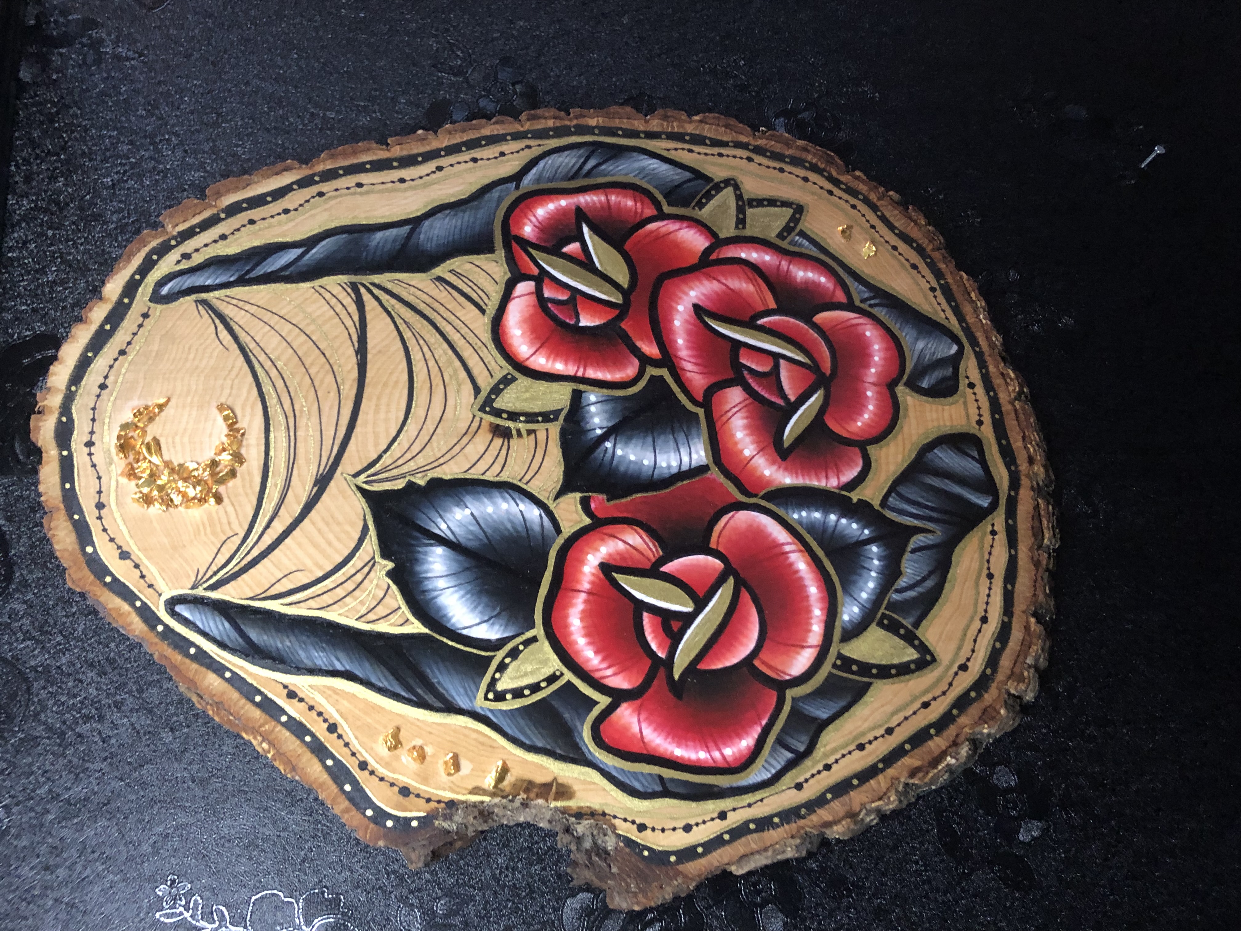 Handpainted image of tattoo-style roses & impala antlers on real wood slice. Mixed media. Matte finish. Hanging hardware attached. 10" length.